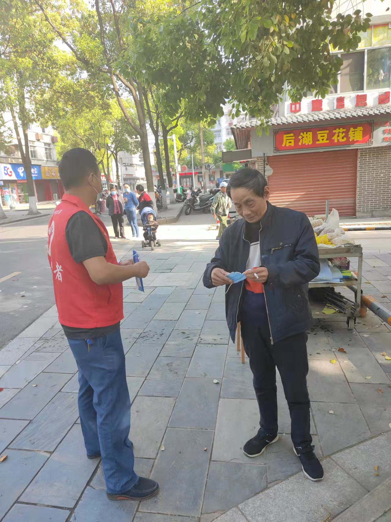 值班领导干部对责任片区开展防疫工作巡查,宣传应用场所码的重要性和必要性,对场所码申请进行指导,督促门店、小区严格落实“一门一码,逢进必扫”相关制度,并指导商户、居民发现红黄码人员后如何有效处置。为引导过往行人规范佩戴口罩,市科技局至今共计为群众赠送口罩1500余个,以实际行动助力全市打好疫情防控战。(津市市科技局:姚虎良)