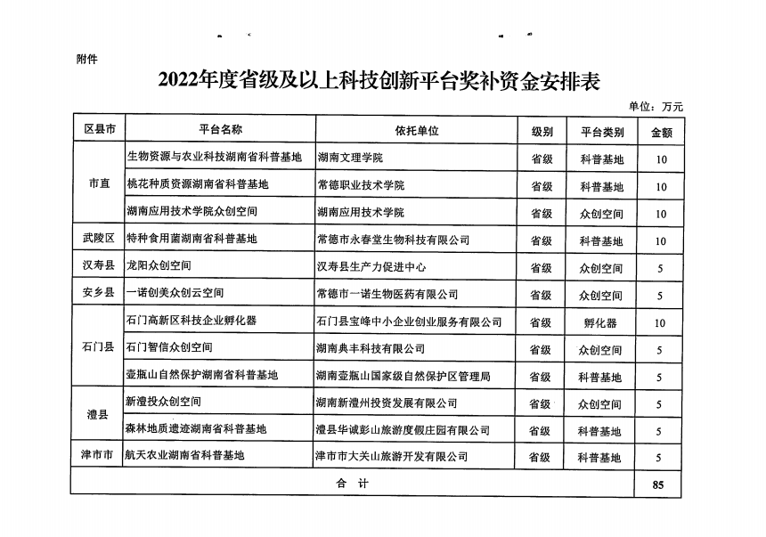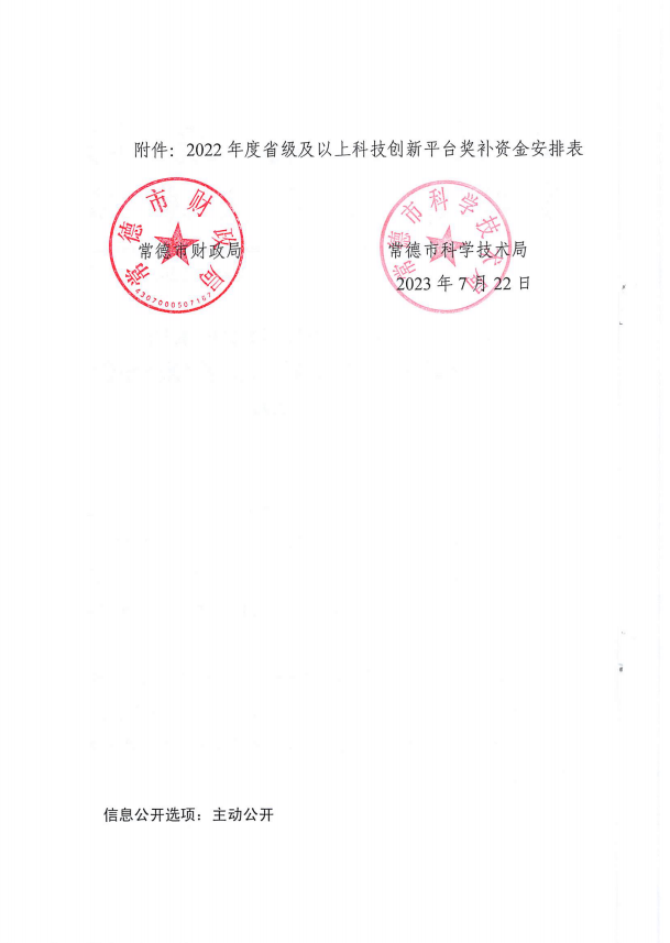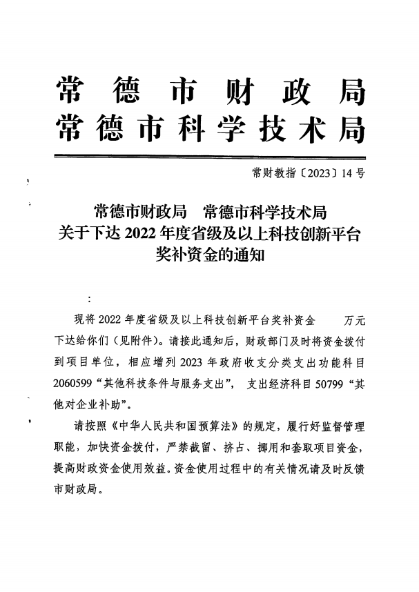 常德市财政局 常德市科学技术局关于下达2022年度省级及以上科技创新平台奖补资金的通知
