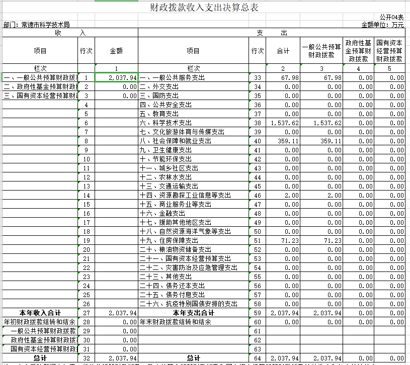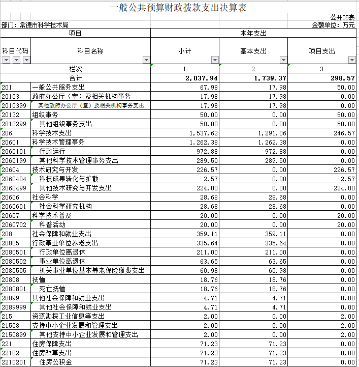 2022年度财政拨款支出2037.94万元,主要用于以下方面:一般公共服务(类)支出67.98万元,占3.34%;科学技术(类)支出1537.62万元,占75.45%;社会保障和就业(类)支出359.11万元,占17.62%;资源勘探工业信息等(类)支出2万元,占0.10%;住房保障(类)支出71.23万元,占3.50%。