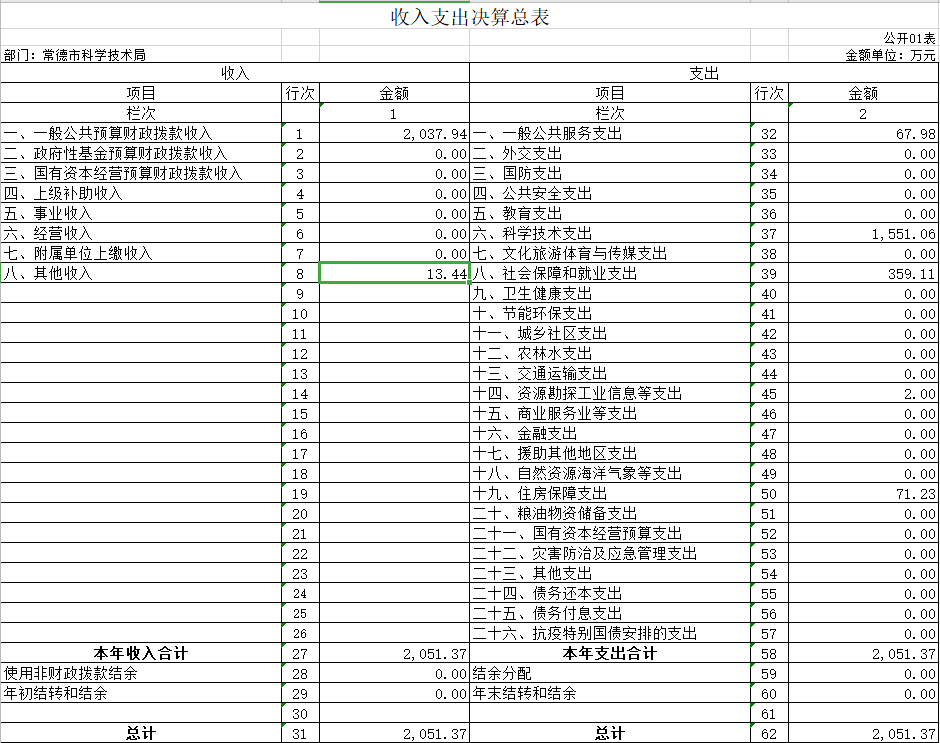 2022年度收入总计2051.37万元。与上年相比,减少49.04万元,减少2.33%,主要是因为本年没有年初结余资金。支出总计2051.37万元。与上年相比,减少49.04万元,减少2.33%,主要是因为本年没有年初结余资金。