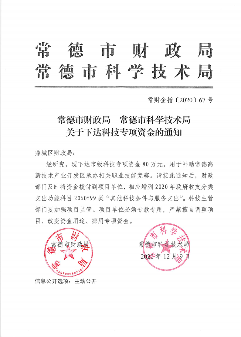 常德市财政局 常德市科学技术局关于下达科技专项资金的通知