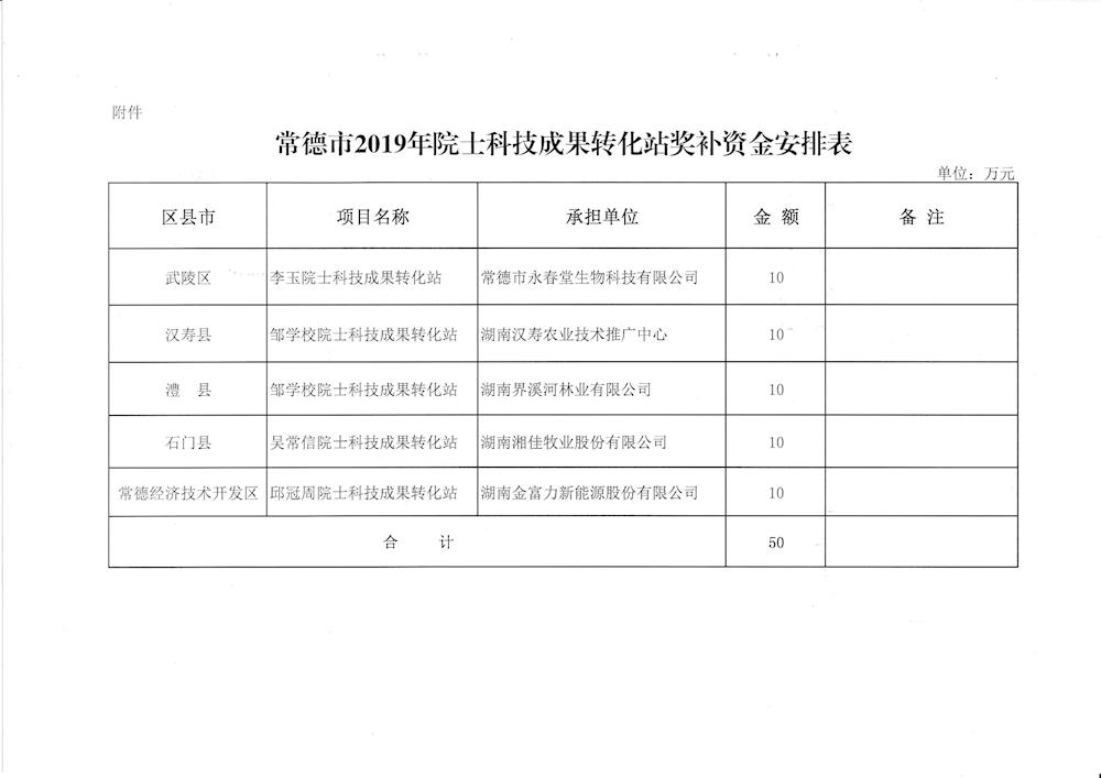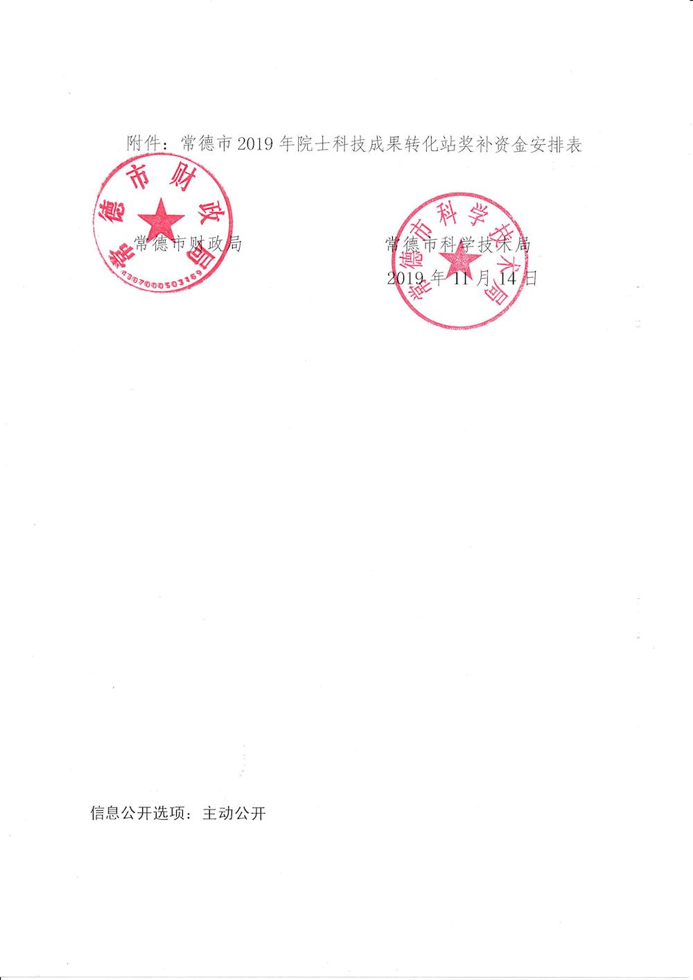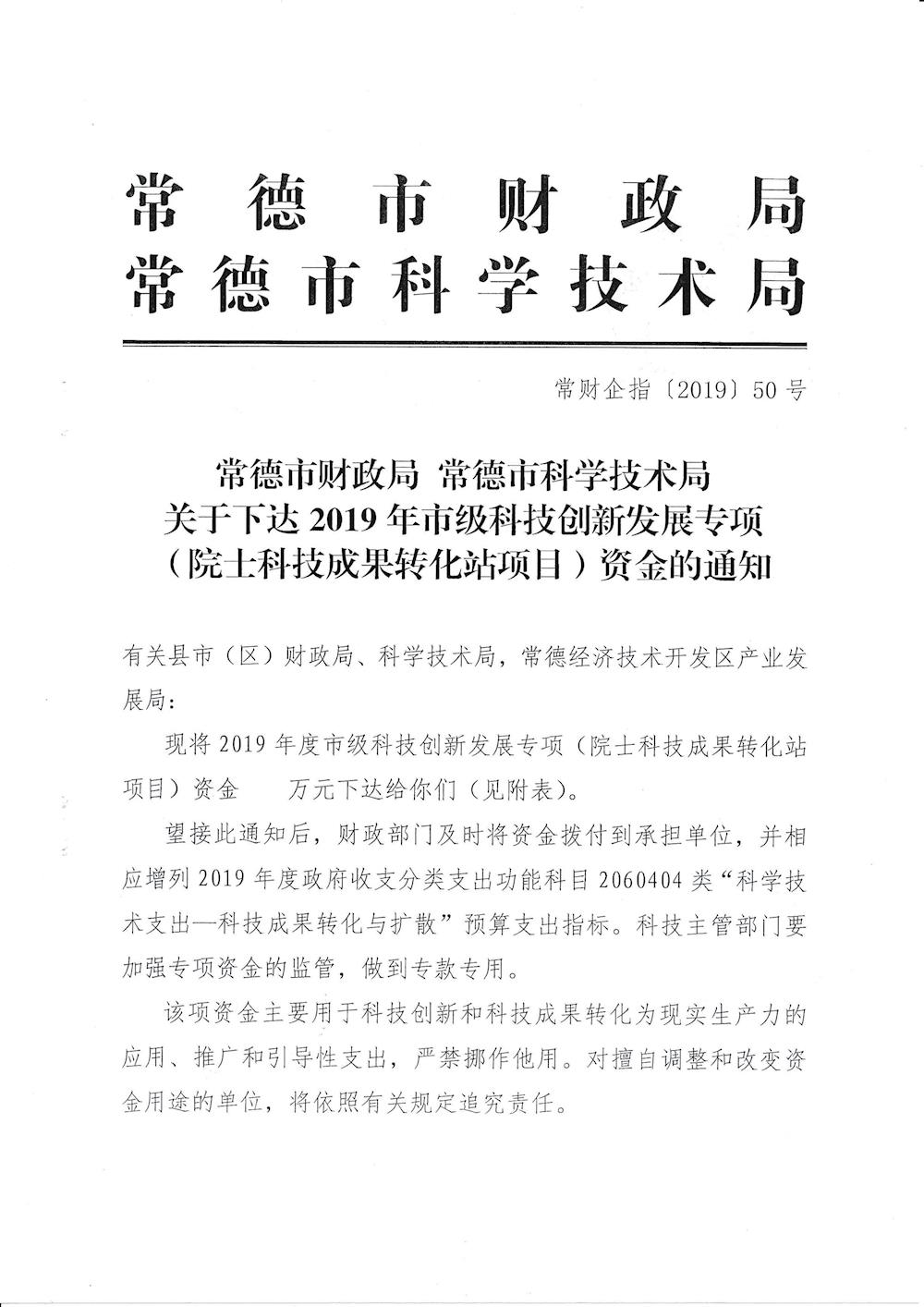 常德市财政局 常德市科学技术局关于下达2019年市级科技创新发展专项(院士科技成果转化站项目)资金的通知
