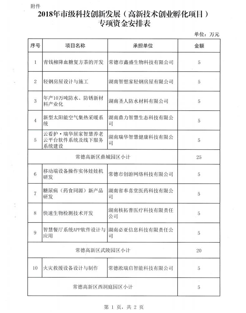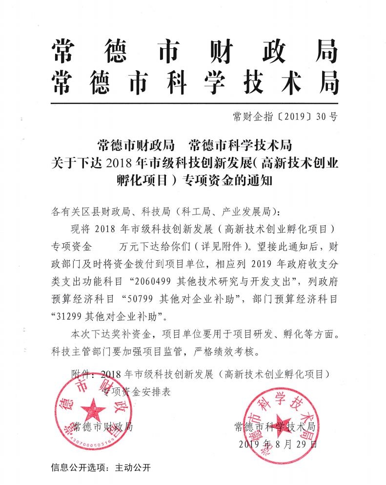 常德市财政局 常德市科学技术局关于下达2018年市级科技创新发展(高新技术创业孵化项目)专项资金的通知