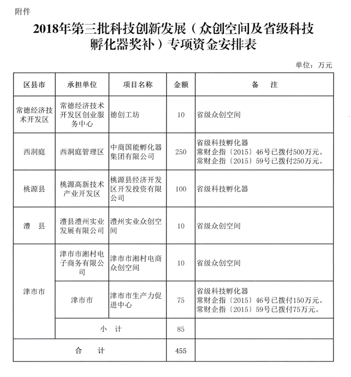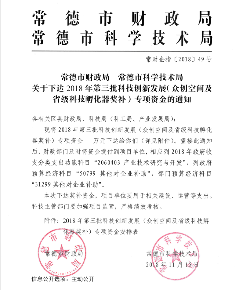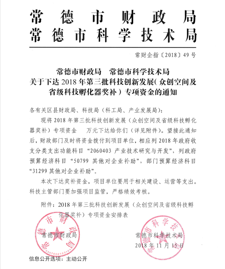 常德市财政局 常德市科学技术局关于下达2018年第三批科技创新发展(众创空间及省级科技孵化器奖补)专项资金的通知