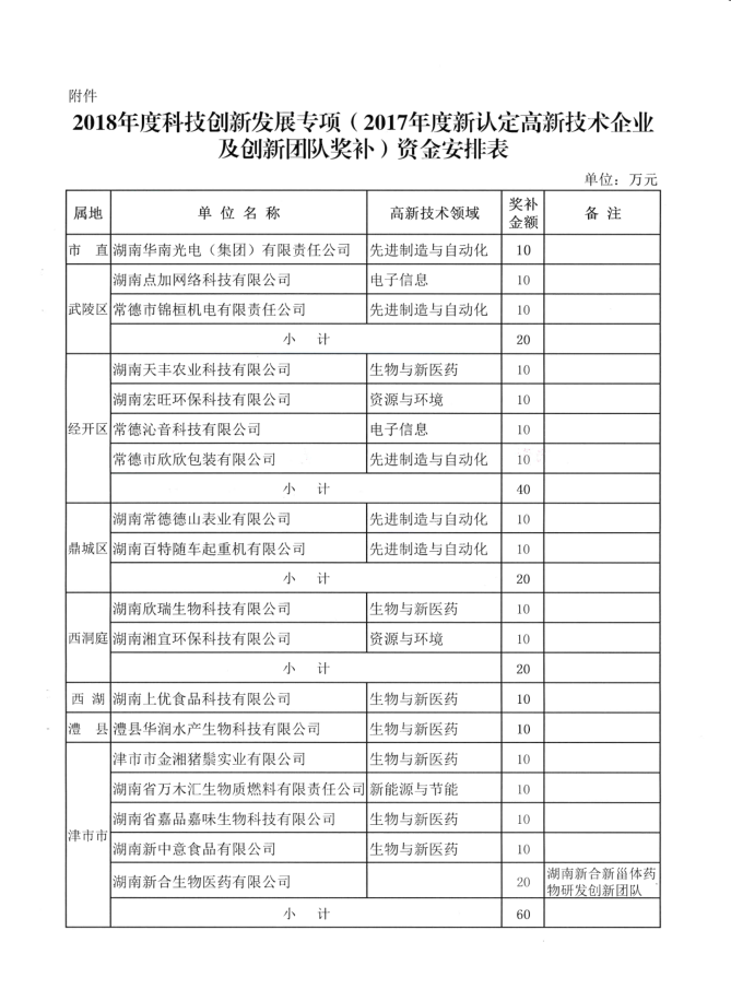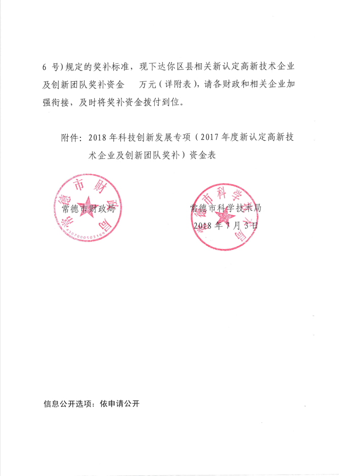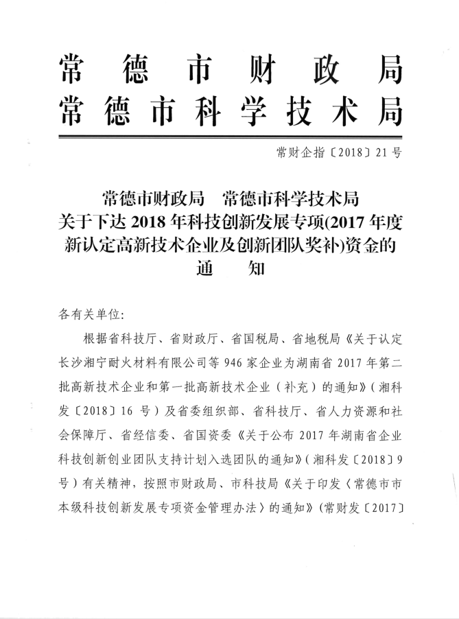 常德市财政局 常德市科学技术局关于下达2018年科技创新发展专项(2017年度新认定高新技术企业及创新团队奖补)资金的通知