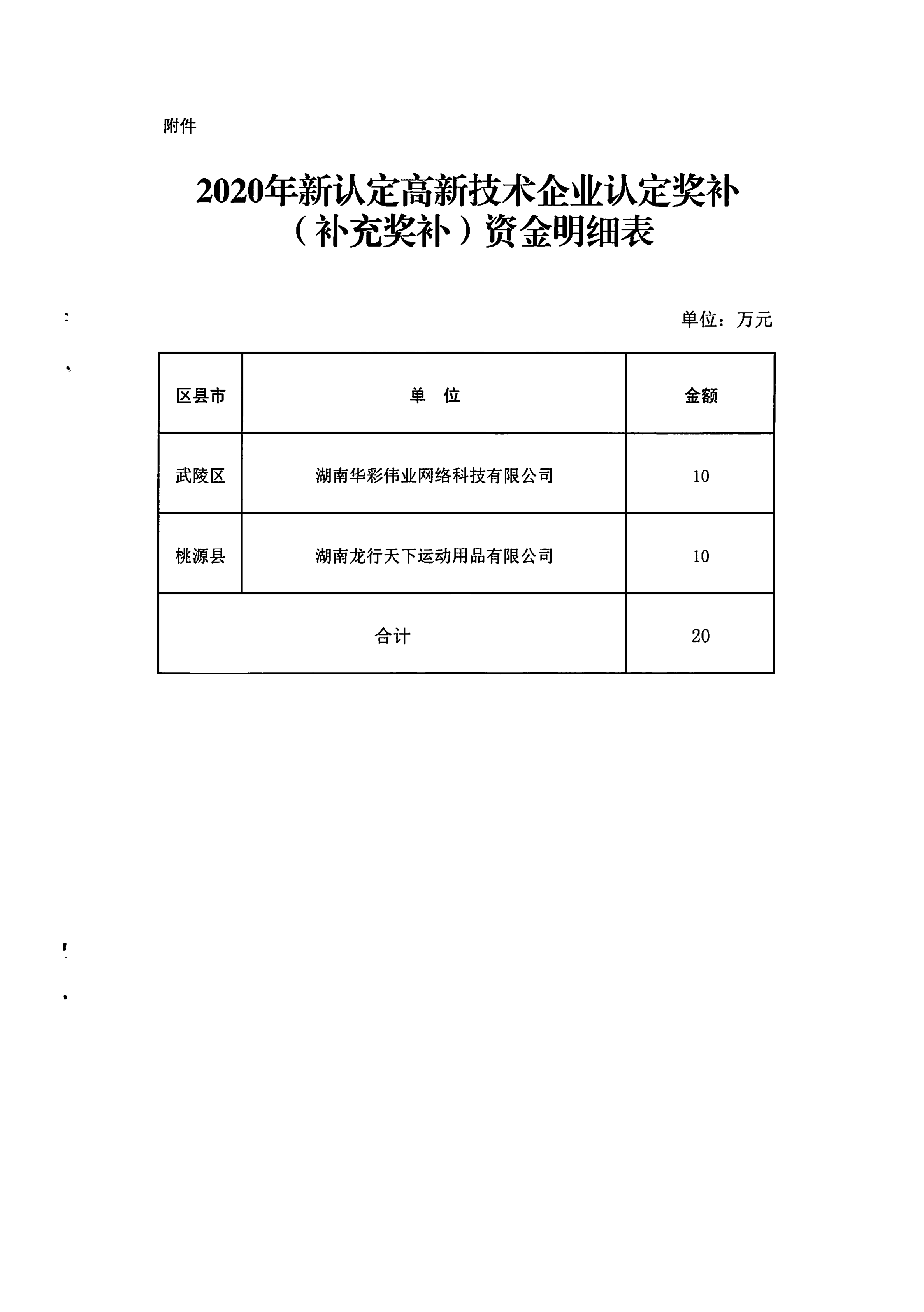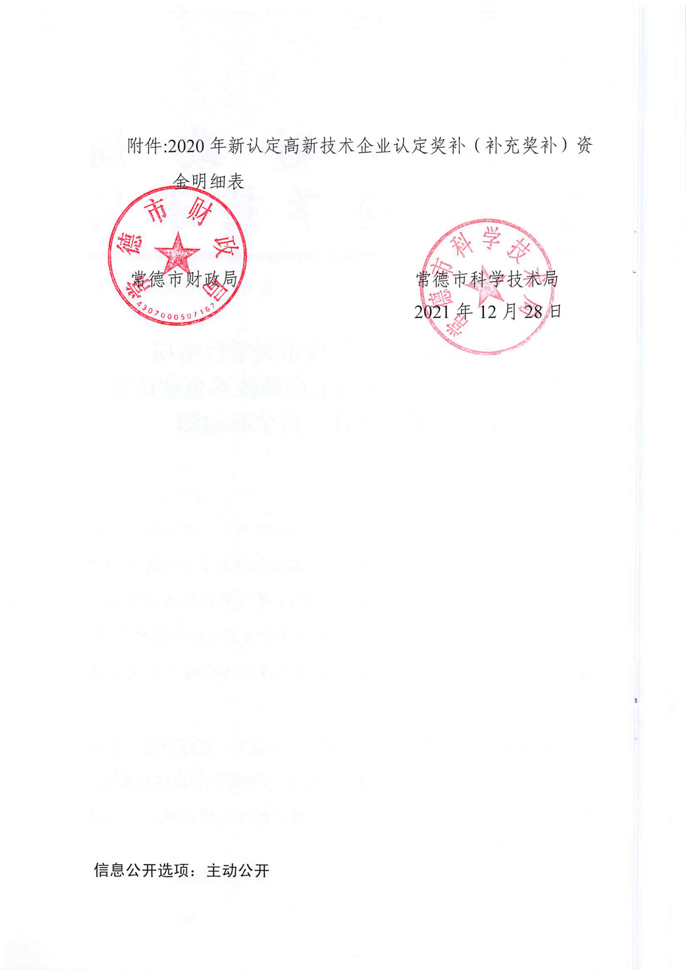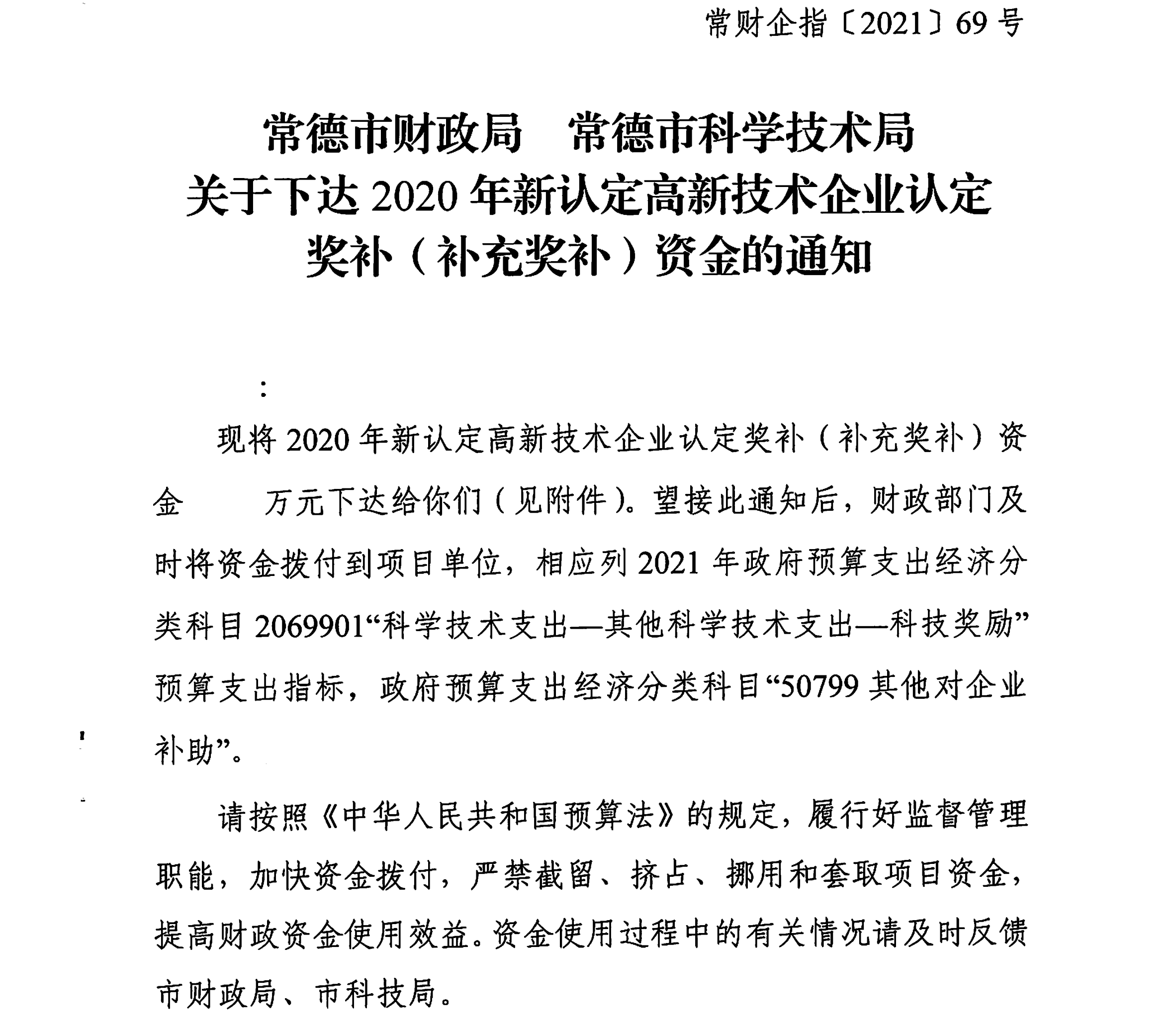 常德市财政局 常德市科学技术局关于下达2020年新认定高新技术企业认定奖补(补充奖补)资金的通知